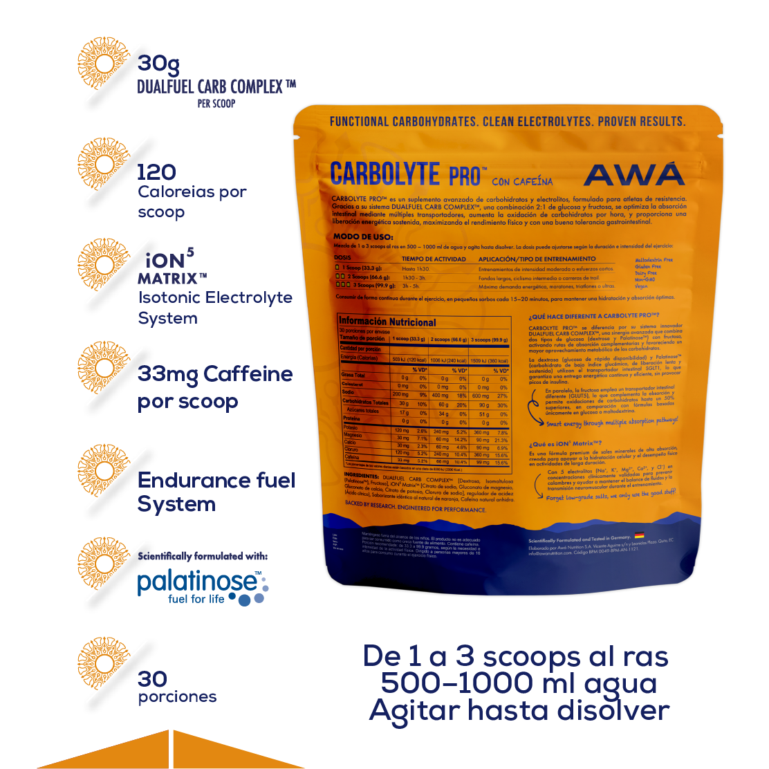 Carbolyte Pro™ es un suplemento avanzado de carbohidratos funcionales y electrolitos premium, formulado para deportes de resistencia y entrenamientos de larga duración. Su sistema DUALFUEL CARB COMPLEX™ (2:1) y su matriz de electrolitos iON⁵ Matrix™ optimizan energía, hidratación y rendimiento sostenido sin causar molestias digestivas.