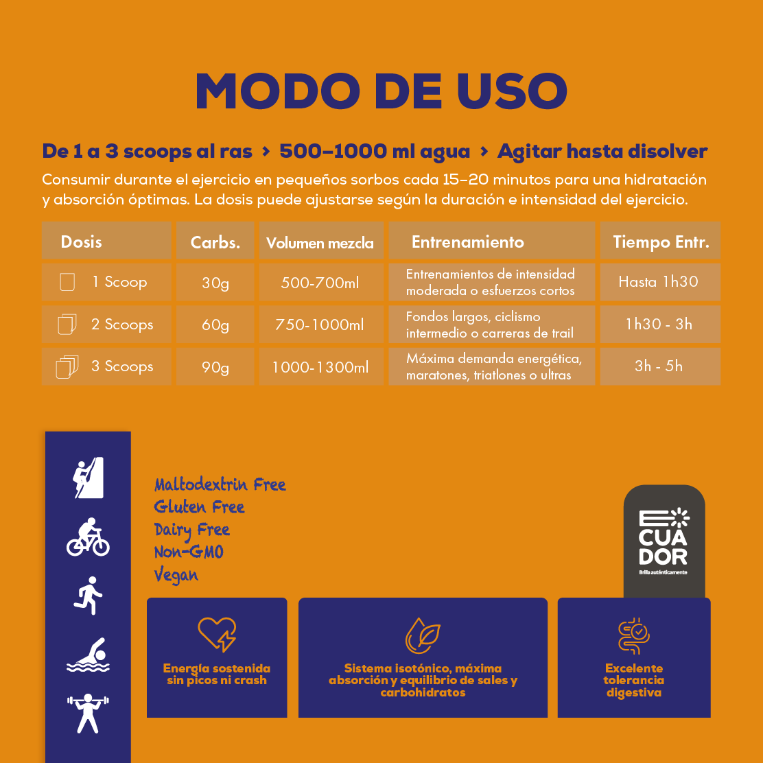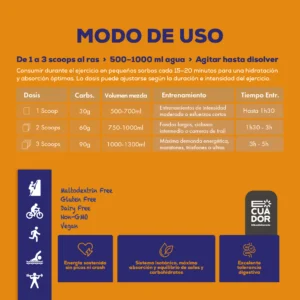 ✔ Usa SGLT1 + GLUT5 para absorber más carbohidratos por hora (hasta 90g/h).
