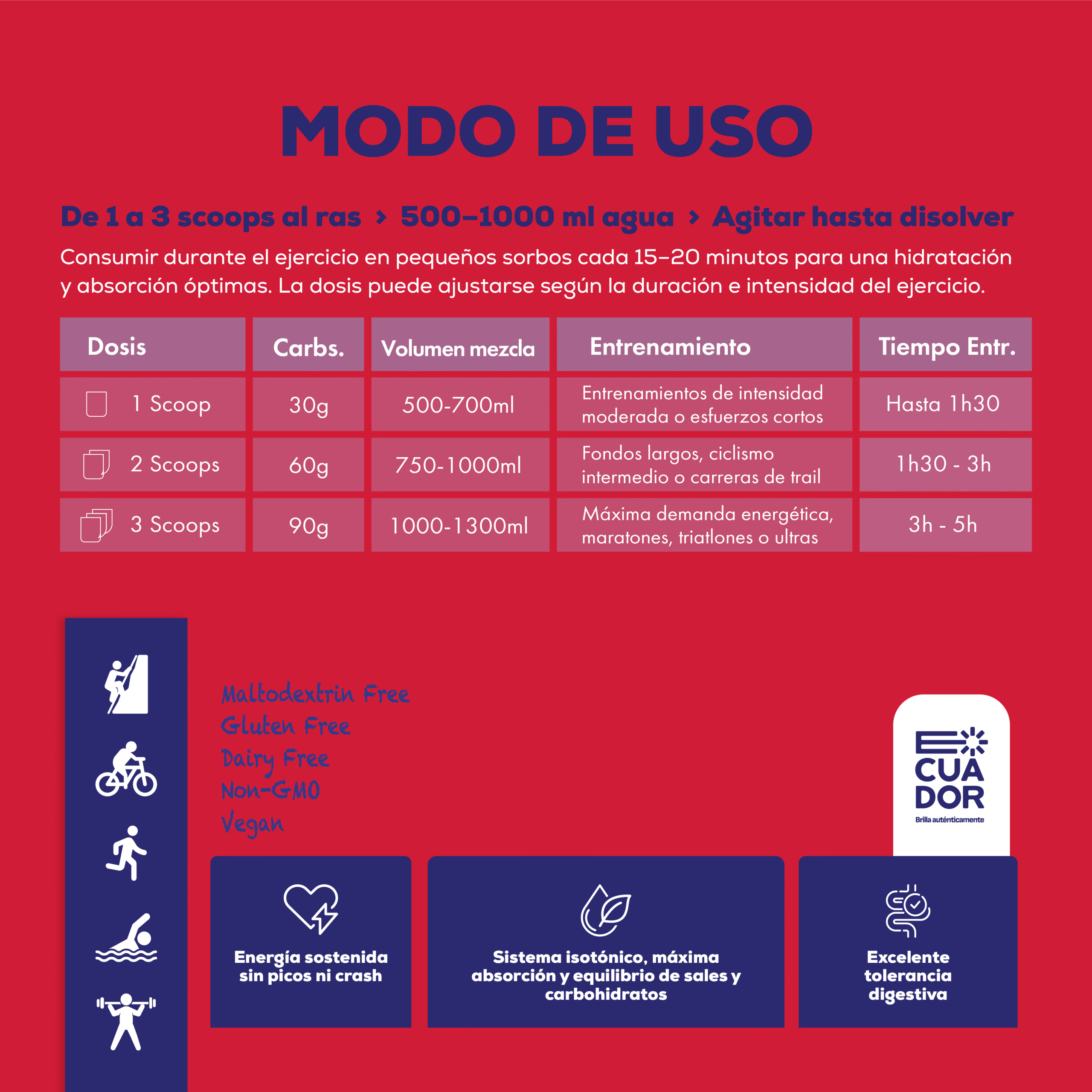 La dextrosa ofrece energía rápida, mientras que Palatinose™, de bajo índice glucémico, libera energía de forma lenta y sostenida. Ambas usan el transportador SGLT1, garantizando un flujo constante de energía sin picos de insulina.