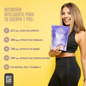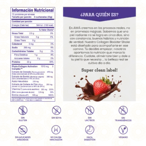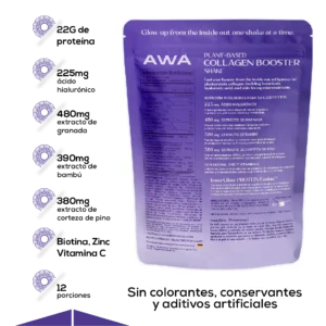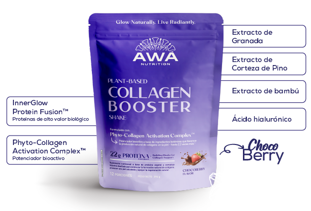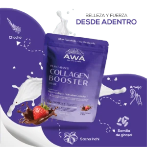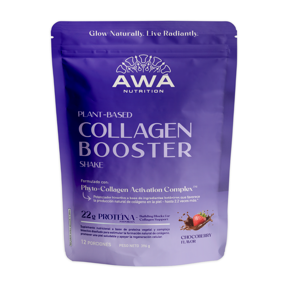 AWÁ Collagen Booster Shake es un suplemento funcional con proteínas vegetales, biotina, zinc, vitamina C y superalimentos antioxidantes.