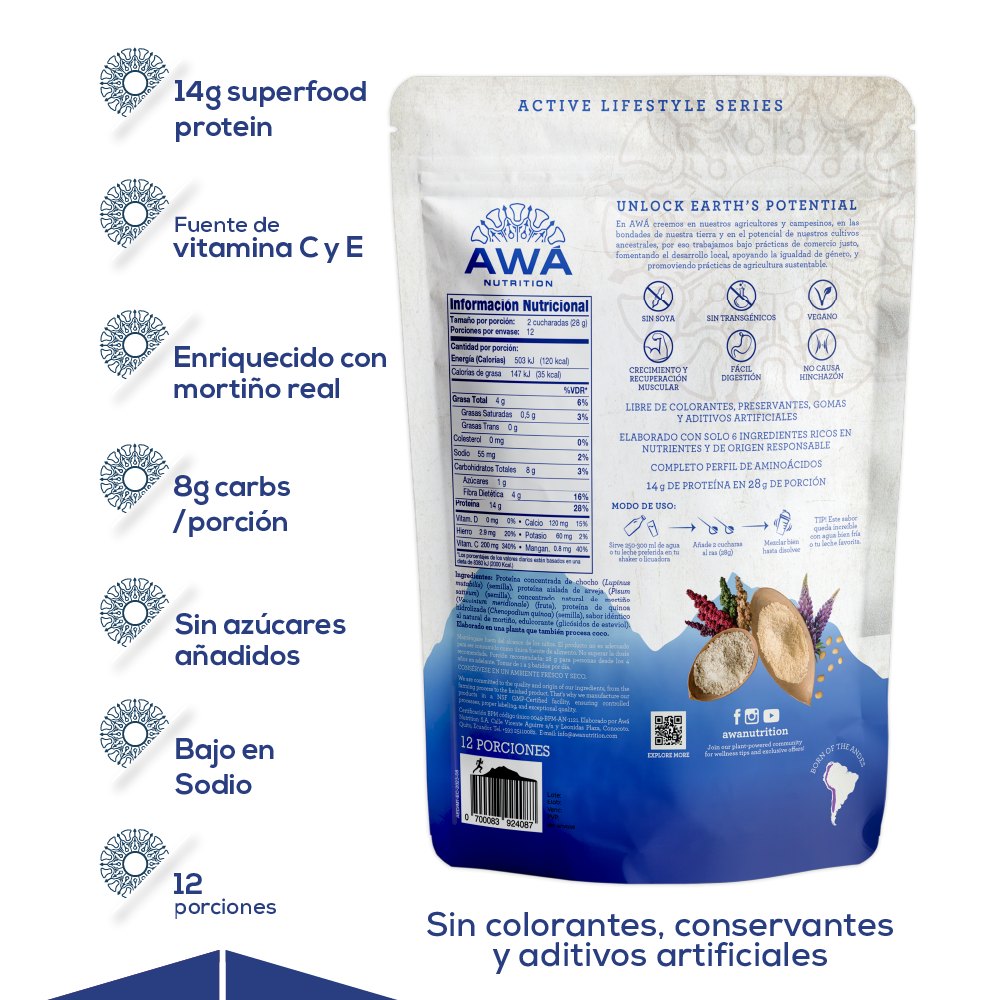 Disfruta de un batido nutricional excepcional elaborado con superalimentos andinos, y enriquecido con auténtico mortiño, que te brinda la proteína y nutrientes necesarios para mantener un estilo de vida activo y saludable, junto con un sabor incomparable.